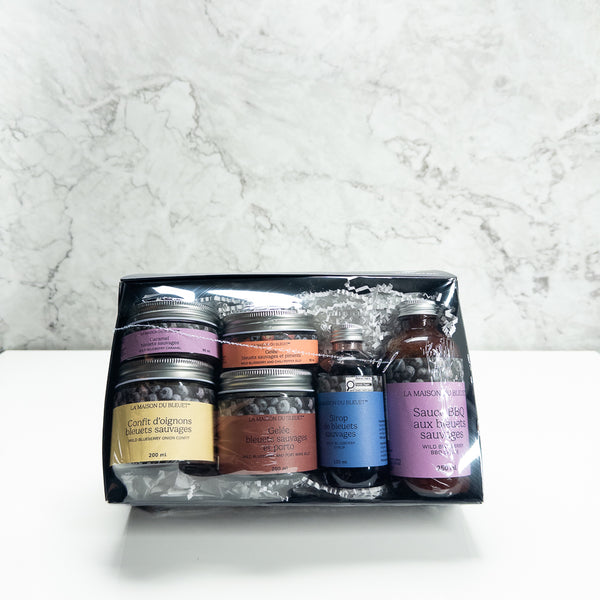 Découvrez l'essence du Lac-Saint-Jean avec notre Boîte Célébration, une sélection curatée de six produits artisanaux à base de bleuets sauvages.