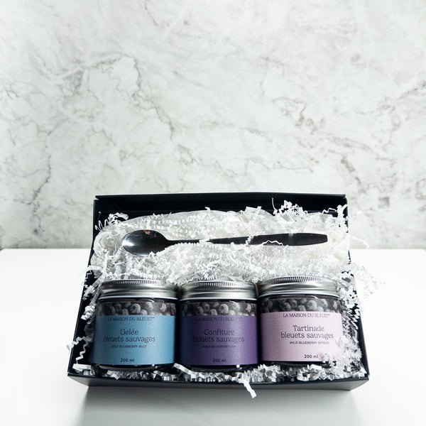 Découvrez notre Boîte essentielle du matin, un coffret cadeau raffiné mettant en vedette les saveurs authentiques du Lac-Saint-Jean. Cette sélection curatée réunit trois délices à base de bleuets sauvages : une confiture généreuse, une tartinade veloutée et une gelée cristalline.