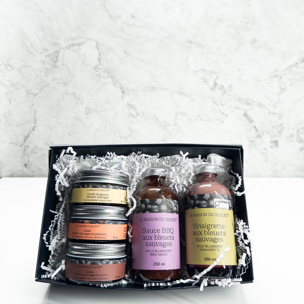 Découvrez notre sélection curatée de cinq produits artisanaux aux bleuets sauvages. Cette boîte réunit une sauce BBQ riche et savoureuse, une vinaigrette délicate pour sublimer vos salades, une gelée de porto sophistiquée, un confit d'oignons caramélisé et une gelée de piments pour les palais aventuriers. Chaque produit capture l'essence des bleuets sauvages du Québec, offrant une palette de saveurs pour transformer vos repas en expériences gastronomiques mémorables.